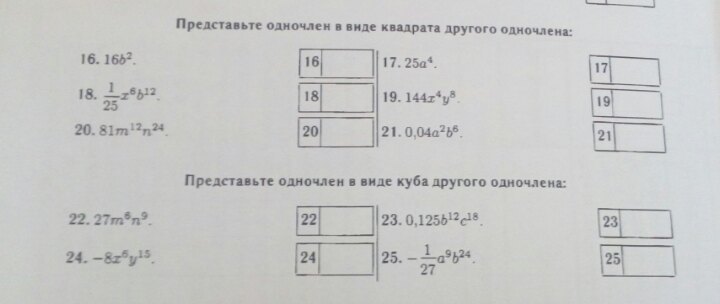 16)(4b)^2;17)(5a^2)^2;18)(1/5x^3b^6)^2;19)(12x^2y^4)^2;20)(9m^6n ^{12} )^2;;21)(0,2ab^3)^2