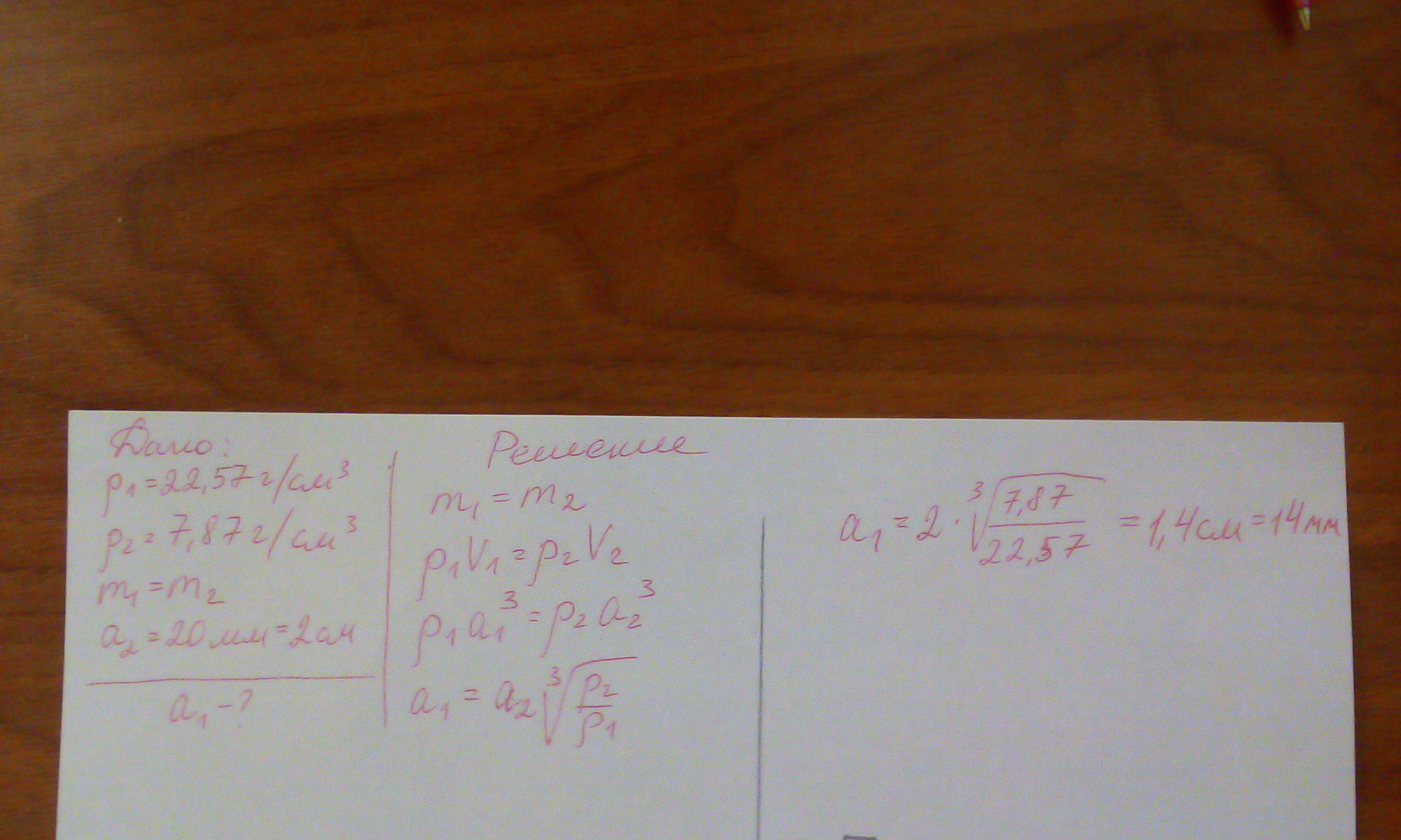 При взвешивании на равноплечных весах кубик из осмия (ρ=22,57 г/см³) уравновесили кубиком из железа (ρ=7,87 г/см³). Какова длина ребра кубика из осмия, если длина ребра железного кубика 20,0 мм?