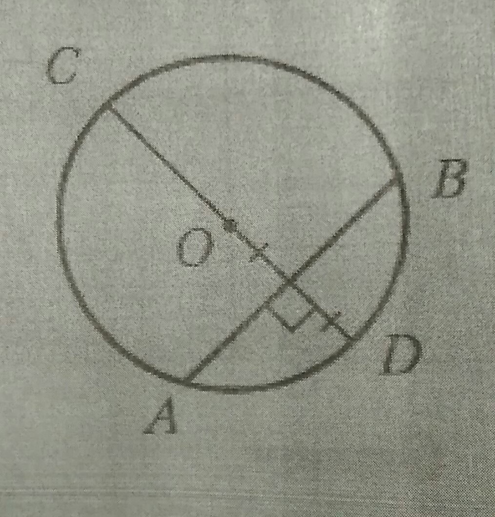 Соединим точки О и А, O и B и обозначим через Е точку пересечения прямых AB и OD. Рассмотрим теперь ΔAOE и ΔBOE. У них сторона OE-общая, стороны AO и BO равны как диаметры окружности. Кроме того, так как углы AED и AEO - смежные при прямой OD, то ∠AED+∠AEO=180°. Но по условию ∠AED=90°, отсюда ∠AEO=180°-90°=90°. Значит, ΔAOE является прямоугольным. Но так как углы AEO и BEO являются смежными при прямой AB, то ∠BEO=180°-∠AEO=180°-90°=90°. Значит, ΔBOE - также прямоугольный. По теореме Пифагора, AE=√(AO²-OE²) и BE=√(BO²-OE²). Но так как AO=BO, то и AE=BE. А тогда AB=2*AE. Так как по условию OE=DE, то OE=OD/2=D/4=8*√3/4=2*√3 см. Тогда AE=√((4*√3)²-(2*√3)²)=√36=6 см и AB=6*2=12 см. Ответ: 12 см.