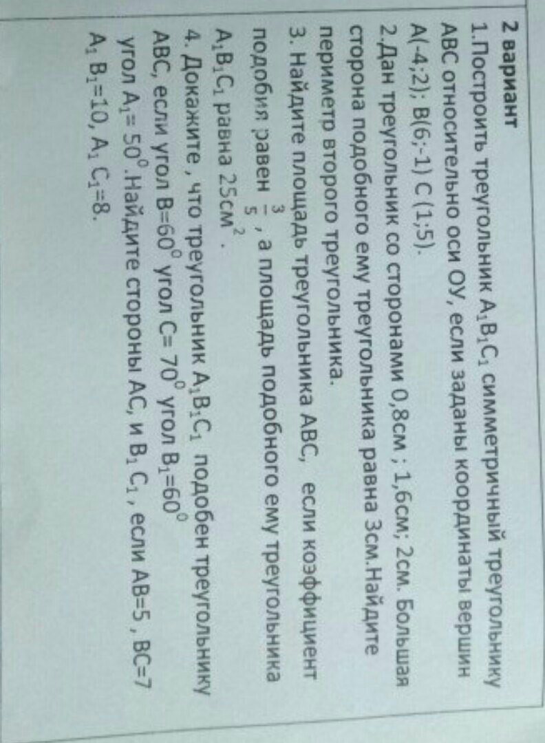 Нарисуйте треугольник DBK, проведите в нём среднюю линию (горизонтально). Точка А будет между DВ, точка С будет между ВК. Это и будет данный меньший треугольник АВС, где АВ=0,8, ВС=1,6, AC=2. Треугольник DBK - это больший, подобный треугольнику АBС. ⇒ Это всё писать в решении не нужно, это для вас инструкция, чтобы нарисовать треугольники. Вот само решение: