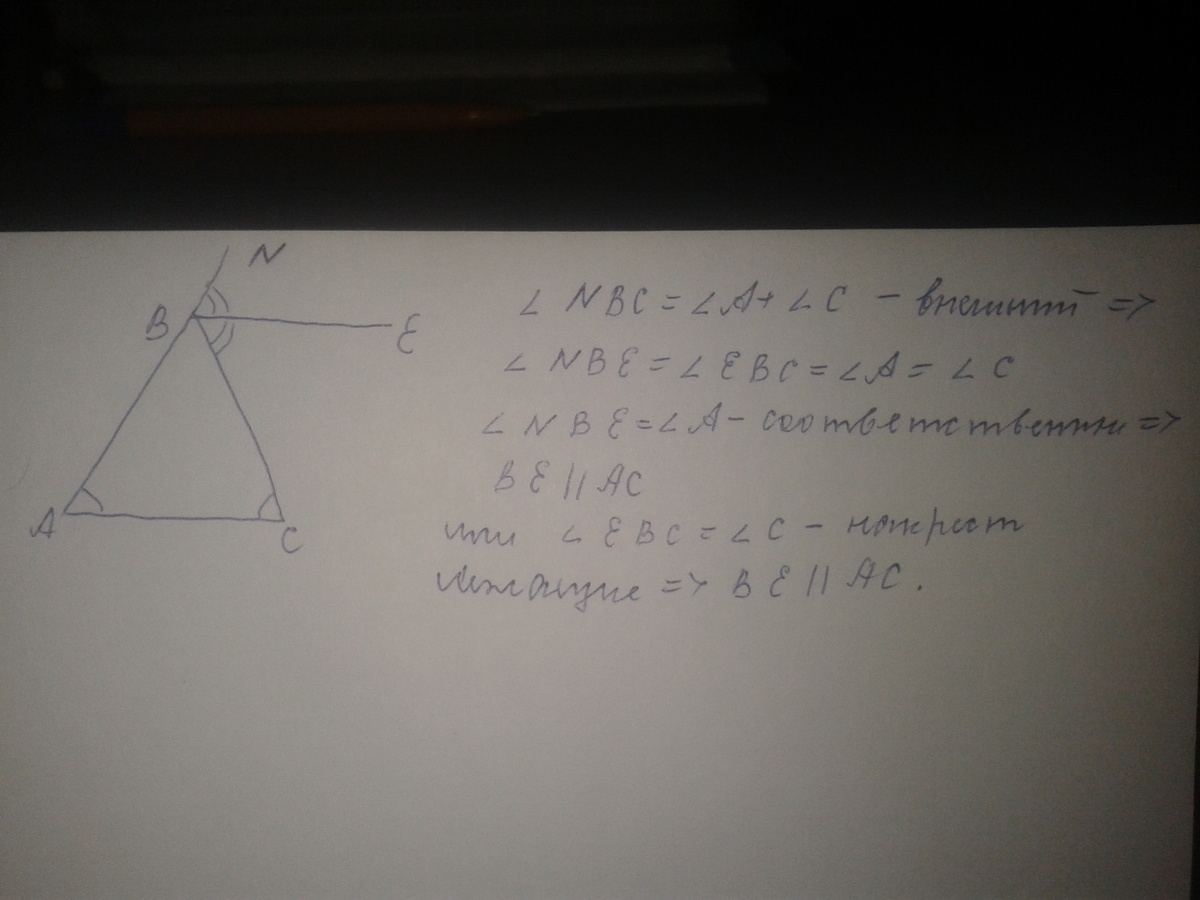 в равнобедренном треугольнике АВС с основанием АС проведена биссектриса ВЕ внешнего угла при вершине В. Определите взаимное расположение прямых ВЕ и АС.