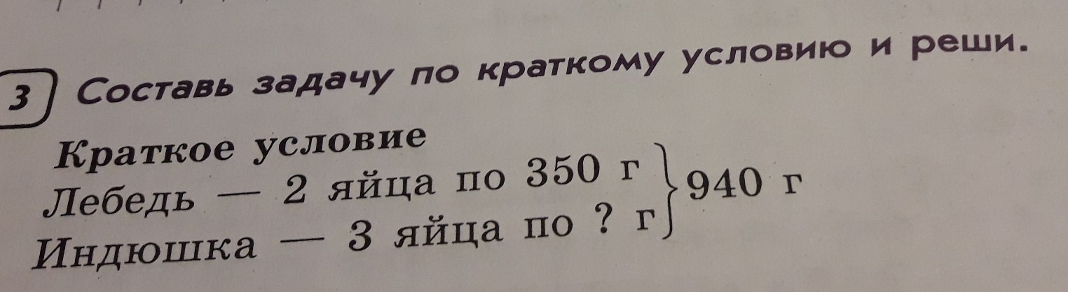 Составьте задачу По краткому условию и решите краткое условие лебедь 2 яйца по 350 г индюшка три яйца по неизвестно грамм вместе 940g