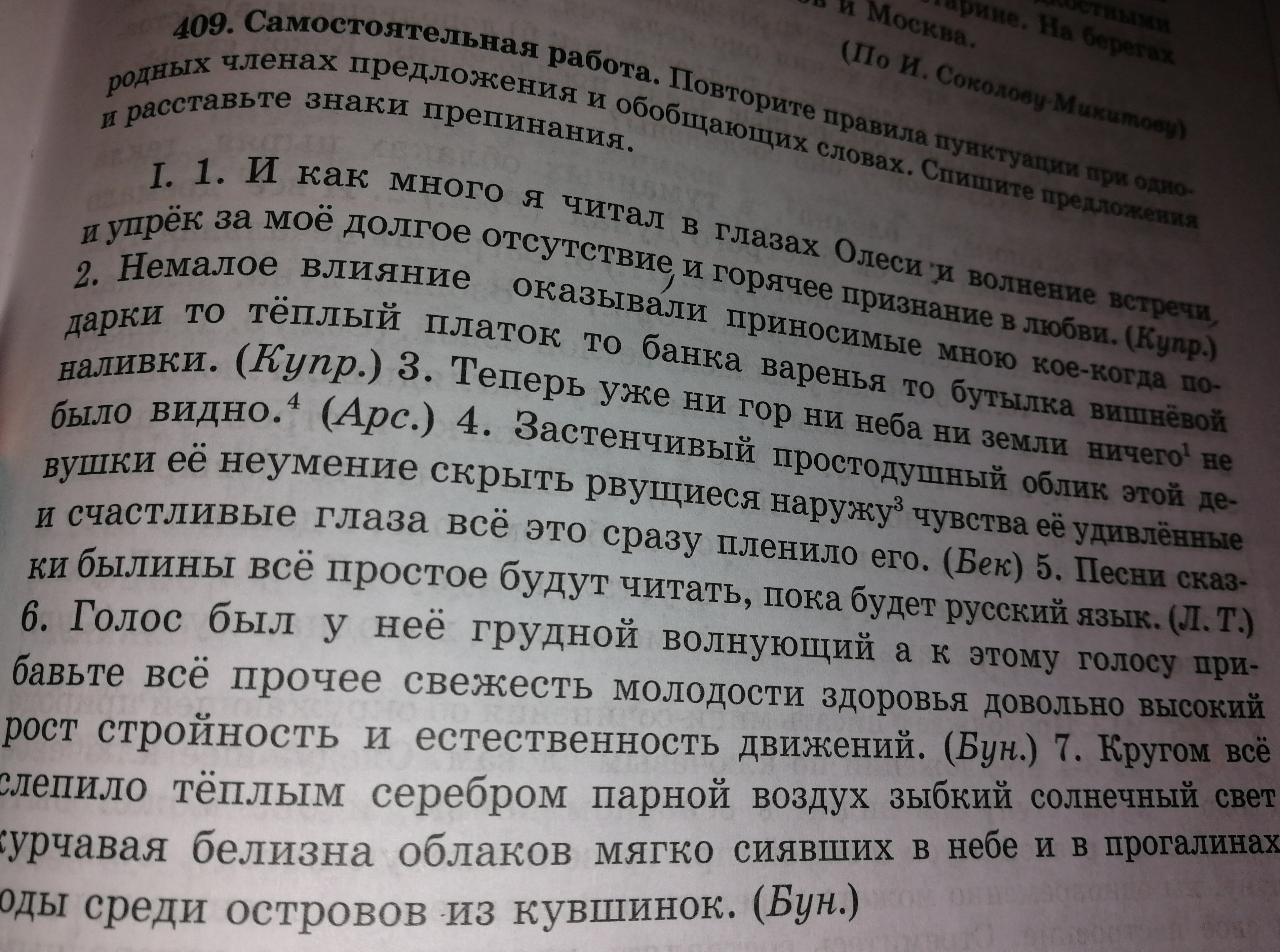 1. И как много я читал в глазах Олеси: и волнение встречи, и упрёк за мое долгое отсутствие, и горячее признание в любви. (Куnр.) 2.Немалое влияние оказывали приносимые мною кое-когда подарки: то теплый платок, то банка варенья, то бутылка вишневой наливки. (Куnр.) 3. Теперь уже ни гор, ни неба, ни земли - ничего не было видно (Apc.) 4. Застенчивый, простодушный облик этой девушки, ее неумение скрыть рвущиеся наружу чувства, ее удивленные и счастливые глаза - все это сразу пленило его. (Бек) 5. Песни, сказки, былины - все простое будут читать, пока будет русский язык. (Л. Т.) 6. Голос был у нее грудной, волнующий, a к этому голосу прибавьте все прочее - свежесть молодости, здоровья, довольно высокий рост, стройность и естественность движений. (Бун.) 7. Кругом всё слепило теплым серебром: парной воздух, зыбкий солнечный свет, курчавая белизна облаков, мягко сиявших в небе и в прогалинах воды среди островов из кувшинок. (Бун.) .