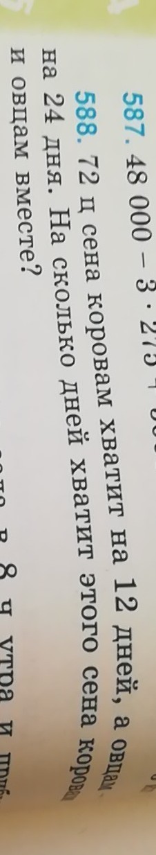 72:12=6 ц сена в день съедают коровы 72:24=3 ц сена в день съедают овцы 6+3=9 ц в день будут съедать коровы и овцы вместе 72:9=8 дней (на 8 дней корма хватит коровам и овцам вместе))))