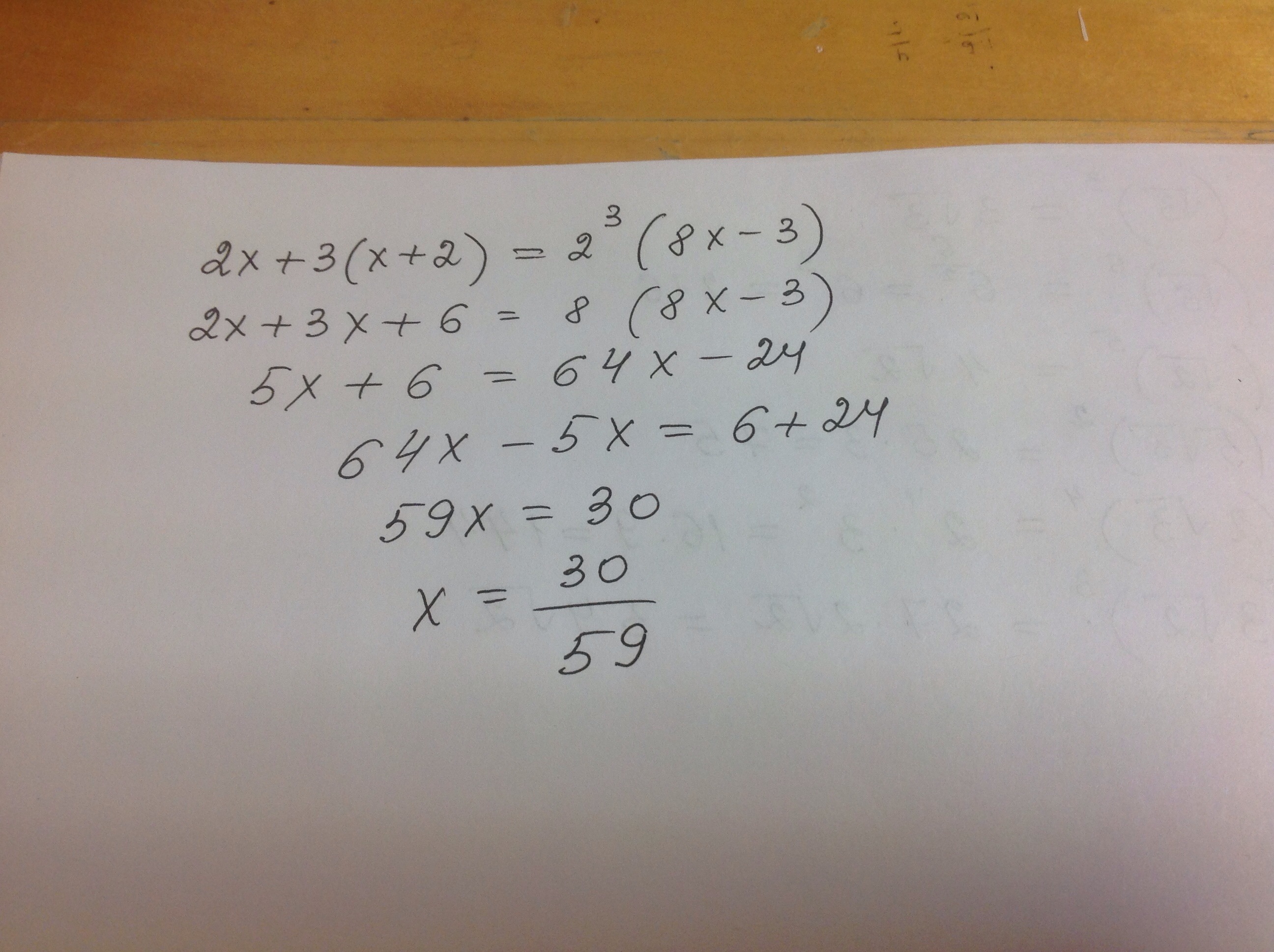 решите уравнение,используя теоремы о равносильности уравнений и правила тождественных преобразований. Обоснуйте каждый шаг:2x+3(x+2)=2^3(8x-3)