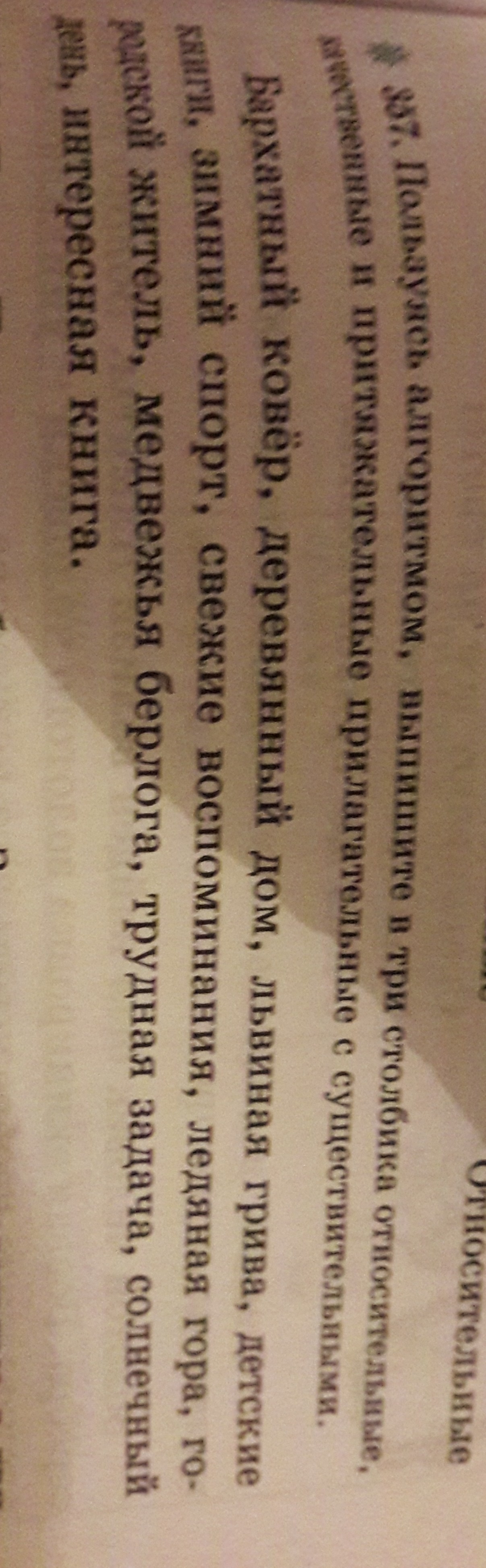 пользуясь алгоритмом, выпишите в три столбика относительные, качественные и притяжательные прилагаетельные с сущиствительными