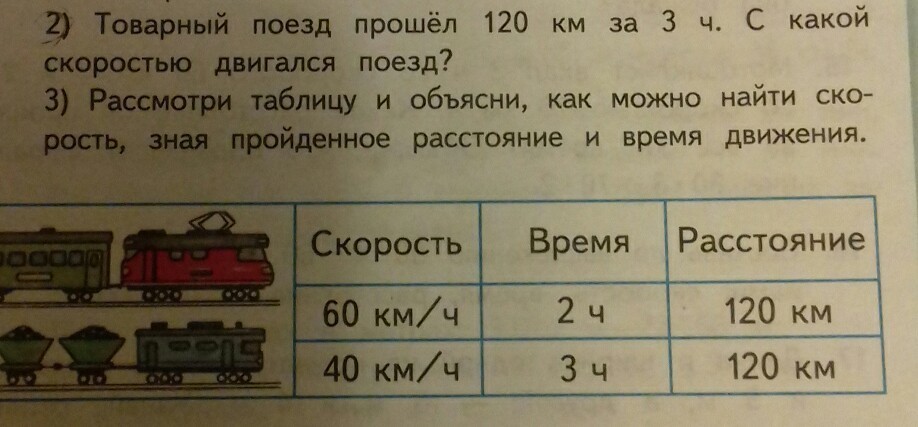 задача Товарный поезд прошёл 120 км за 3 часа. с какой скоростью двигался поезд? начерти таблицу! только задание номер 3 не надо