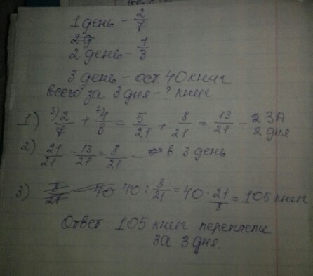 Ученики помогали в школьной библиотеке переплетать книги. В первый день они перепели 2 седьмых всех книг во второй день 1 третьих книг а в третий день остальные 40 книг Сколько всего переплели ученики за 3 дня