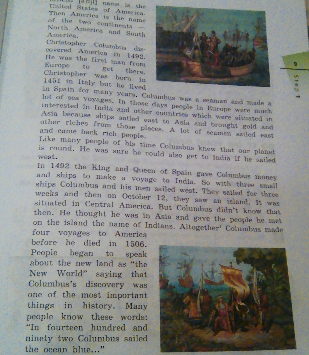США-содененные штаты Америки пошло из-за того что у Америки есть южная и северная часть Кристофер Колумб посетил ее в 1492 он был первым человеком из Европы что был здесь К.Колумб родился в 1451 в Италии но жил в Испании много лет Колумб был водным путешественником и сделал несколько путешествий в те дни люди из Европы были заинтересованы в Индии многие путешественники уходили туда и возрощались богатыми людьми В то время как и многие люди Колумб знал, что земля Круглая в 1492 король с королевой Испании дали Колумбу деньги и коралби Колумб и его люди сделали путешествие и путешеств. 3 недели и 12 октября они увидели остров это была Центральная Америка но Колумб не знал это он думал что это была Азия Колумб сделал 4 путешествия в Америку и умер в 1506 году люди начали говорить про новою земли и после этого Колумб стал человеком попавший в историю человечества (перевёл самое важное и главное УДАЧИ!) )