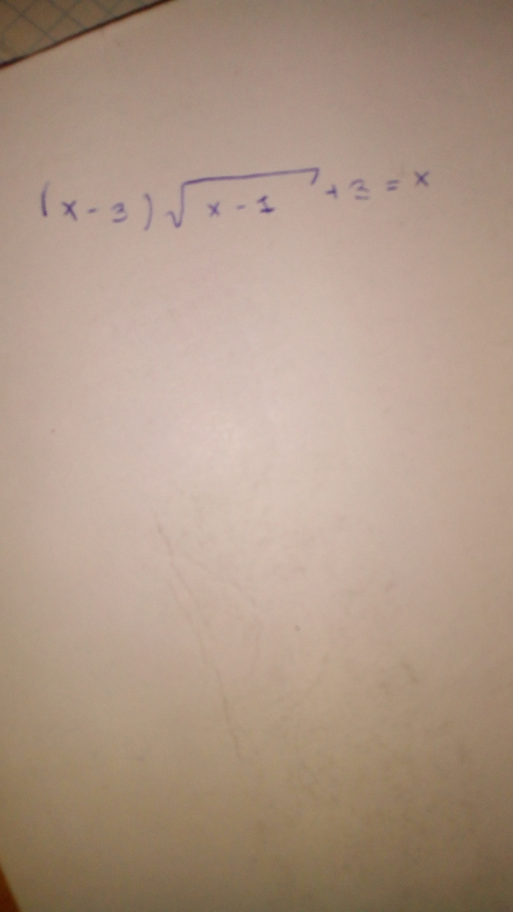 (x-3)sqrt{x-1}+3=x \ (x-3)sqrt{x-1}=x-3 \ (x-3)^2(x-1)=x^2-6x+9 \ (x-3)^2(x-1)=(x-3)^2 \ (x-3)^2(x-1)-(x-3)^2=0 \ (x-3)^2(x-1-1)=0 \ (x-3)^2(x-2)=0 \ (x-3)^2=0 \ x-2=0 \ x=3;2