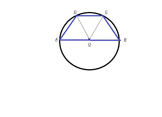 Так как радиус R=OA=OD=OC=OB, то по 1 признаку равенства треугольников получаем ΔAOD=ΔDOC=ΔCOB . Эти треугольники являются ещё и равносторонними ( т.к. они равнобедренные с углом