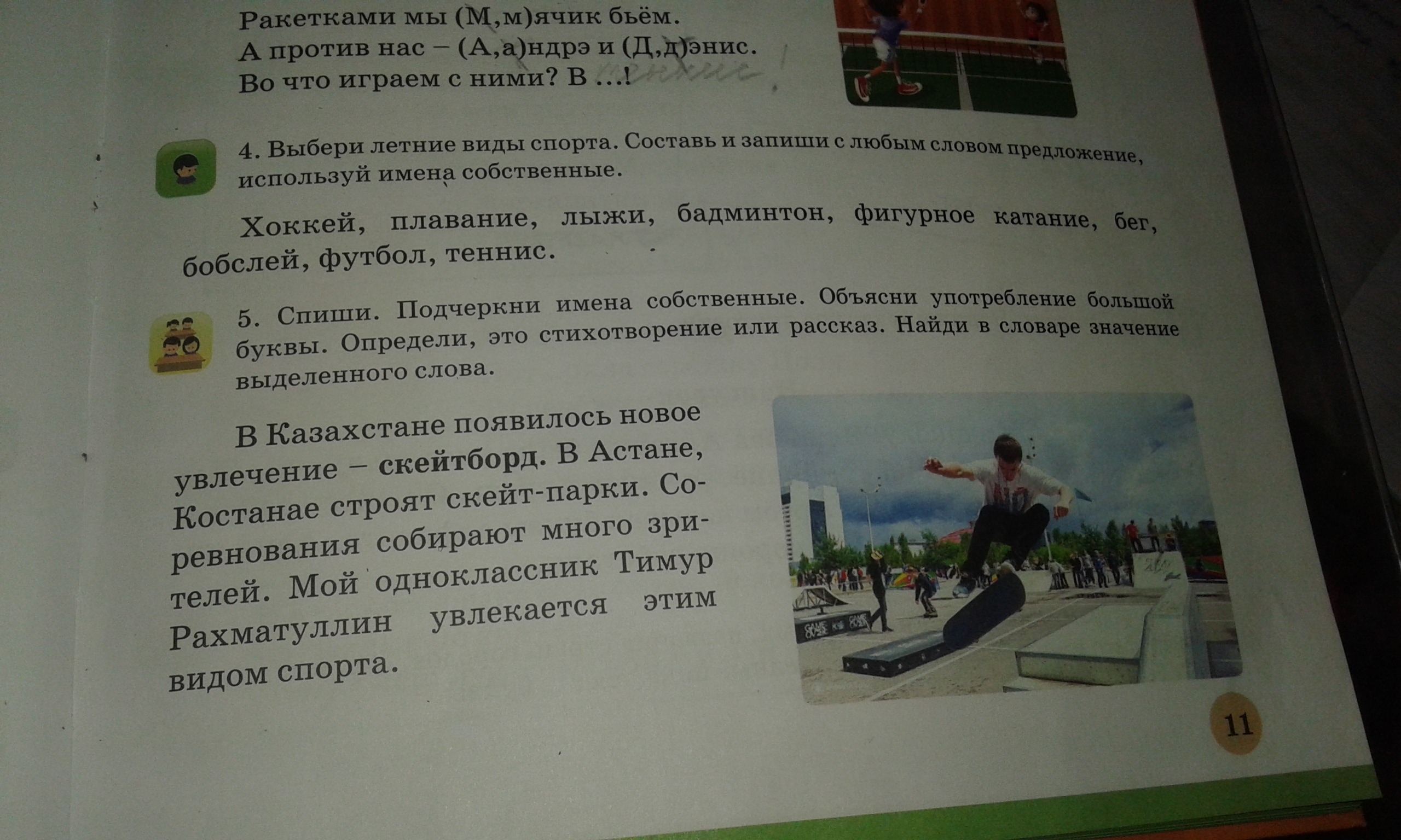В Казахстане ( с. ) появилось новое увлечение - скейтборд. В Астане (с.), Костанае ( с. ) строят в скейт- парки. Соревнования собирают много зрителей. Мой одноклассник Тимур( с. ) Рахматуллин ( с. ) увлекаются этим видом спорта .