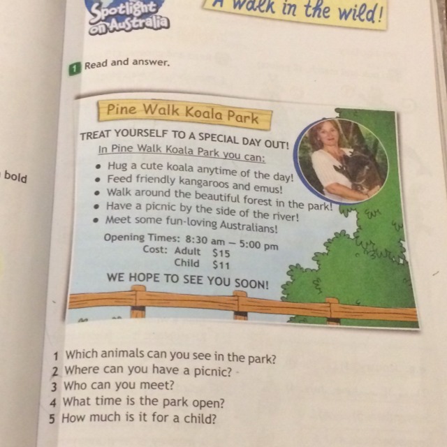 1) Каких животных можно увидеть в парке? Ответ - Koalas, kangaroos and emu