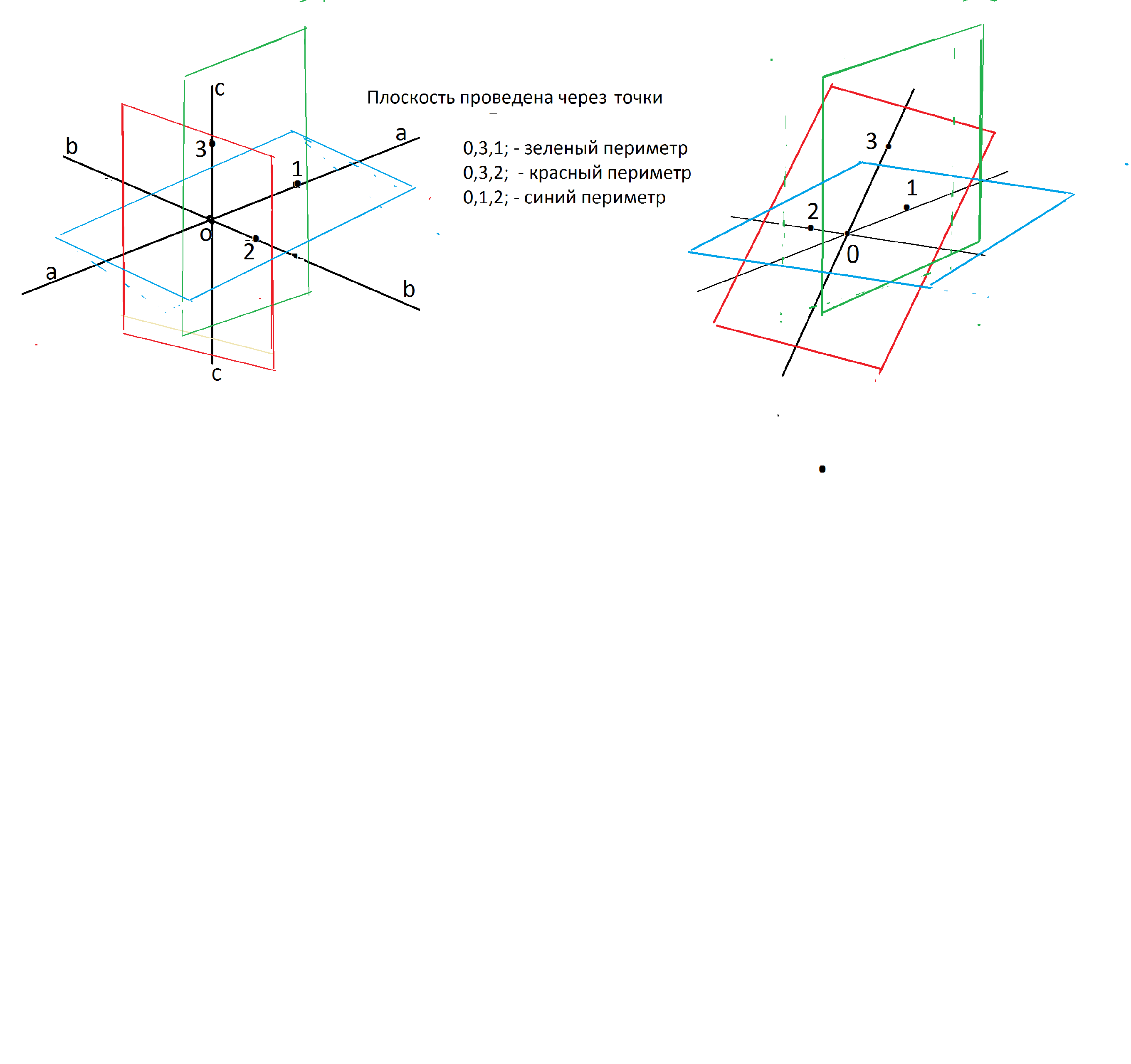 Отметим точку пересечения 0, точки на каждой прямой 1, 2, 3 соответственно