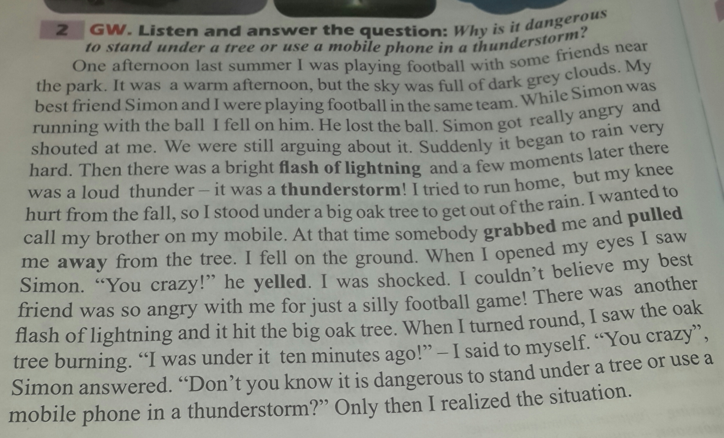 Однажды в полдень прошлым летом я играл с некоторыми друзьями в футбол рядом с парком. День был тёплым, но небо было полно серых облаков. Мой лучший друг Саймон и я играли в футбол в одной команде. Пока Саймон бежал с мячом, я упал на него. Он потерял мяч. Саймон серьёзно разозлился и закричал на меня.Мы всё еще спорили из-за этого. Вдруг начался очень сильный дождь. Появилась яркая вспышка и через несколько секунд громкий гром- это была гроза! Я попытался побежать домой, но мои коленки болели после падения, поэтому я встал под большой дуб, чтобы не попасть под дуб. Я хотел позвонить моему брату по мобильнику. В это время кто-то подкрался ко мне и потащил меня от дерева. Я упал на землю. Когда я открыл глаза, я увидел Саймона. Ты сумасшедший!- закричал он.Я был в шоке. Я не мог поверить, что мой лучший друг так разозлился из-за дурацкой игры. Потом появилась ещё одна молния и задела большой дуб.Когда я повернулся, тр увидел, что дуб горит. Я был под ним 10 минут назад- сказал я себе. Ты сумасшедший- ответил Саймон.Ты знаешь что это опасно стоять под деревом или звонить по телефону во время грозы? Только тогда я все понял