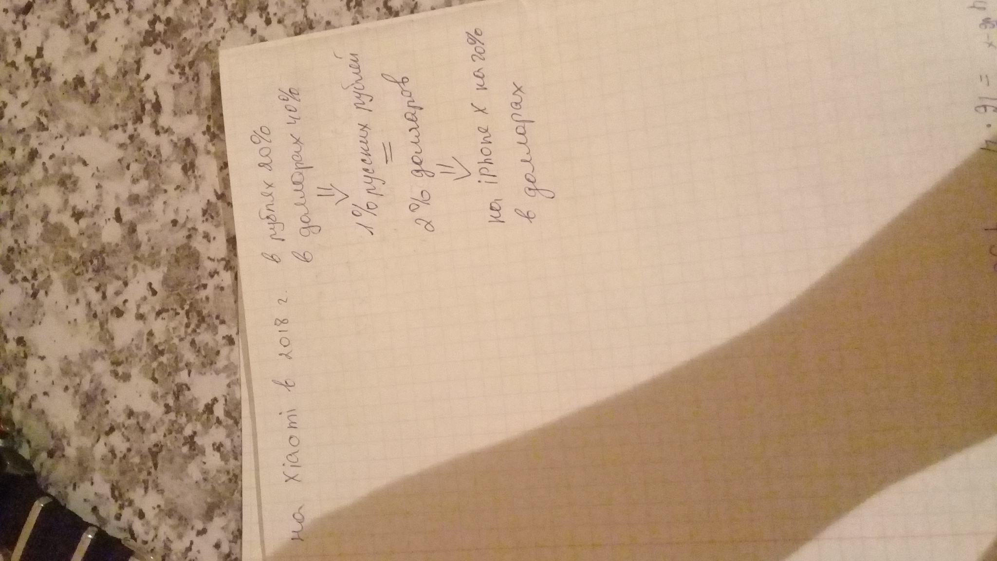По прогнозам аналитиков цены на смартфоны китайского бренда Xiaomi в 2018 году упадут в рублях РФ в среднем на %20 , а в долларах США на %40 . В то же время прогнозируется снижение цены iPhone X на %10 в рублях РФ. На сколько процентов упадут цены на iPhone X в долларах США?