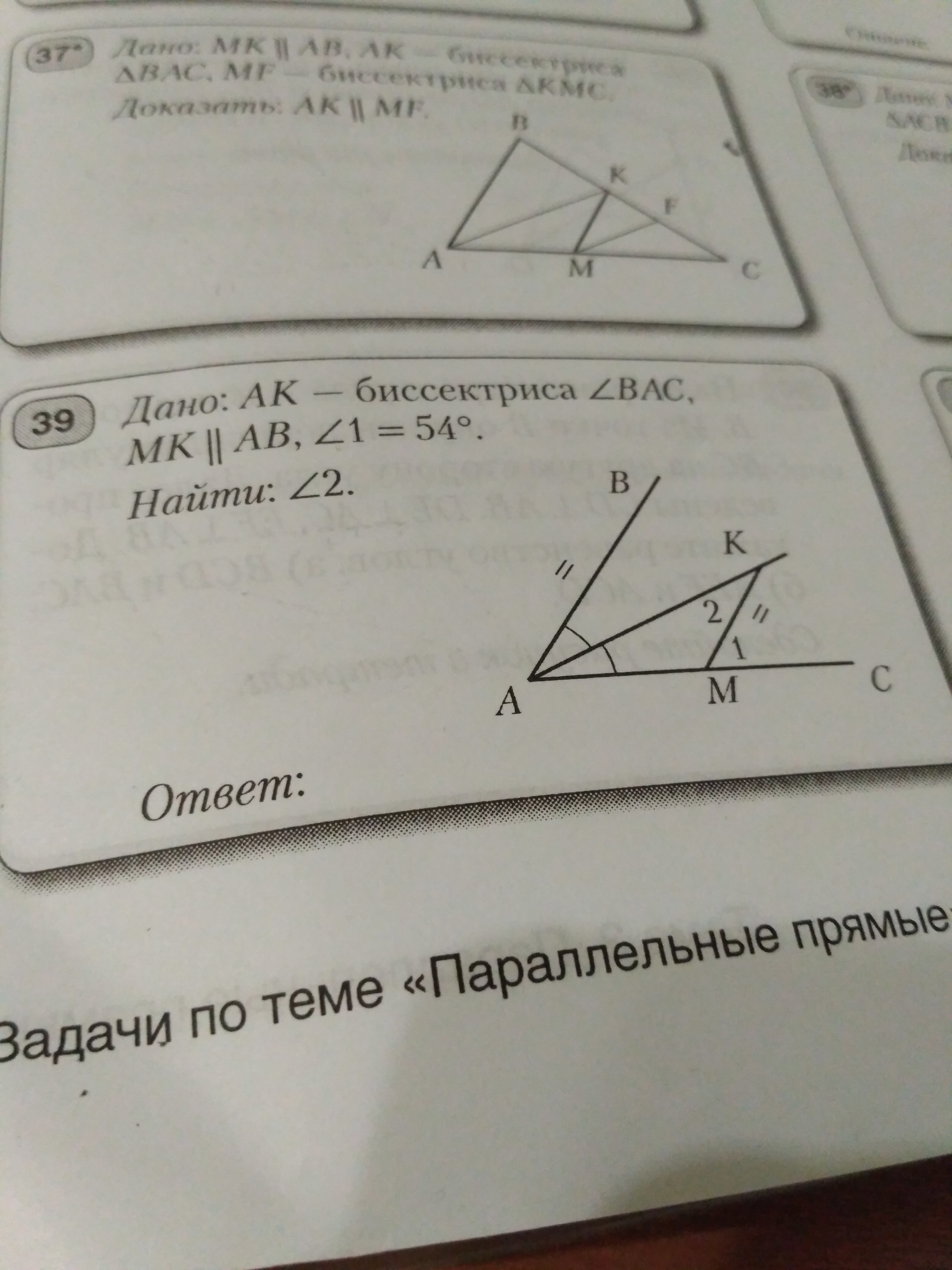 МК ∥ АВ, поэтому угол КМС= углу ВАС = 54° (свойство параллельности прямых).