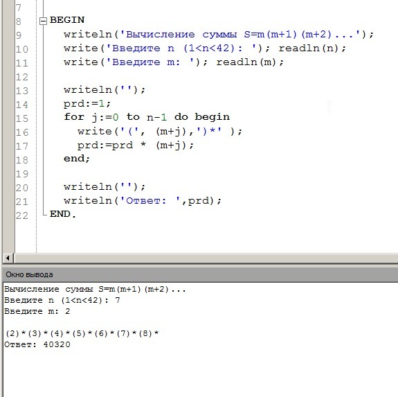 //Вычислите сумму S=m(m+1)(m+2)...n