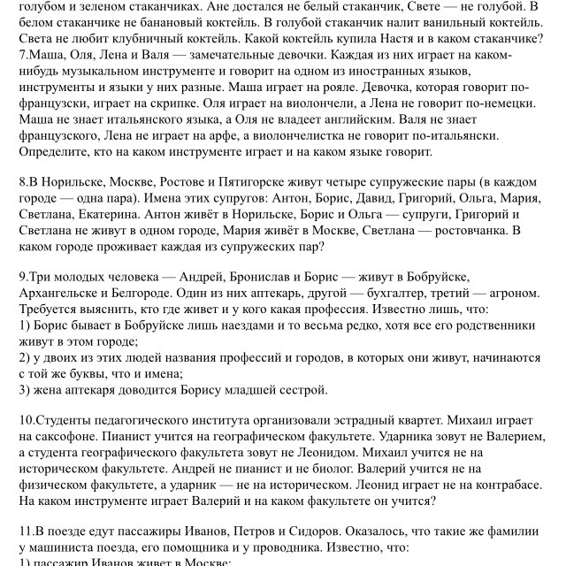 7. Маша-рояль,английский; Оля-виолончель,немецкий; Лена-скрипка,французский; Валя-арфа,итальянский.