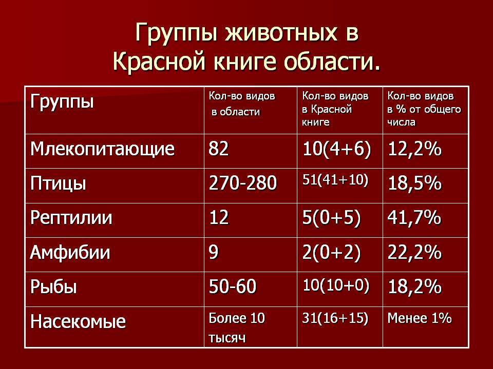 Сколько видов организмов разных групп внесено в Красную книгу Тамбовской области.