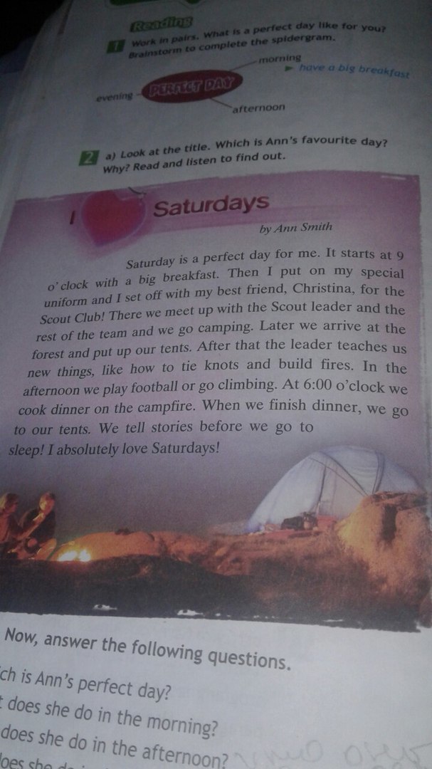 ит стратс фе найн о клок виз а биг брэкфаст. Зен я пут он май спешл юнифоом этд ай сет оф виз май бэст френд.Кристина фо скоот клаб.зеа ви мет ап виз зе скоот лидер энд зе рест оф зе тим этд ви гоу кэмпин.Лэйтер ви эрайв ат зе форест этд пут ап ау тентс. Арте зет зе лидэТичз аз нью тхинкс (здесь межзубный з) лайк хау то тай нотс энд билд фаэз. Ин зэ афтенун ви плэй футбл о гоу клаймбин.Эт сикс о клок ви кук динер он зе кэмп фаэ.Вен ви финиш дине рви гоу ту ауа тентс.Ви тел сториз бефор ви гоу слип.Ай эбсолутли лав сатэдэйз