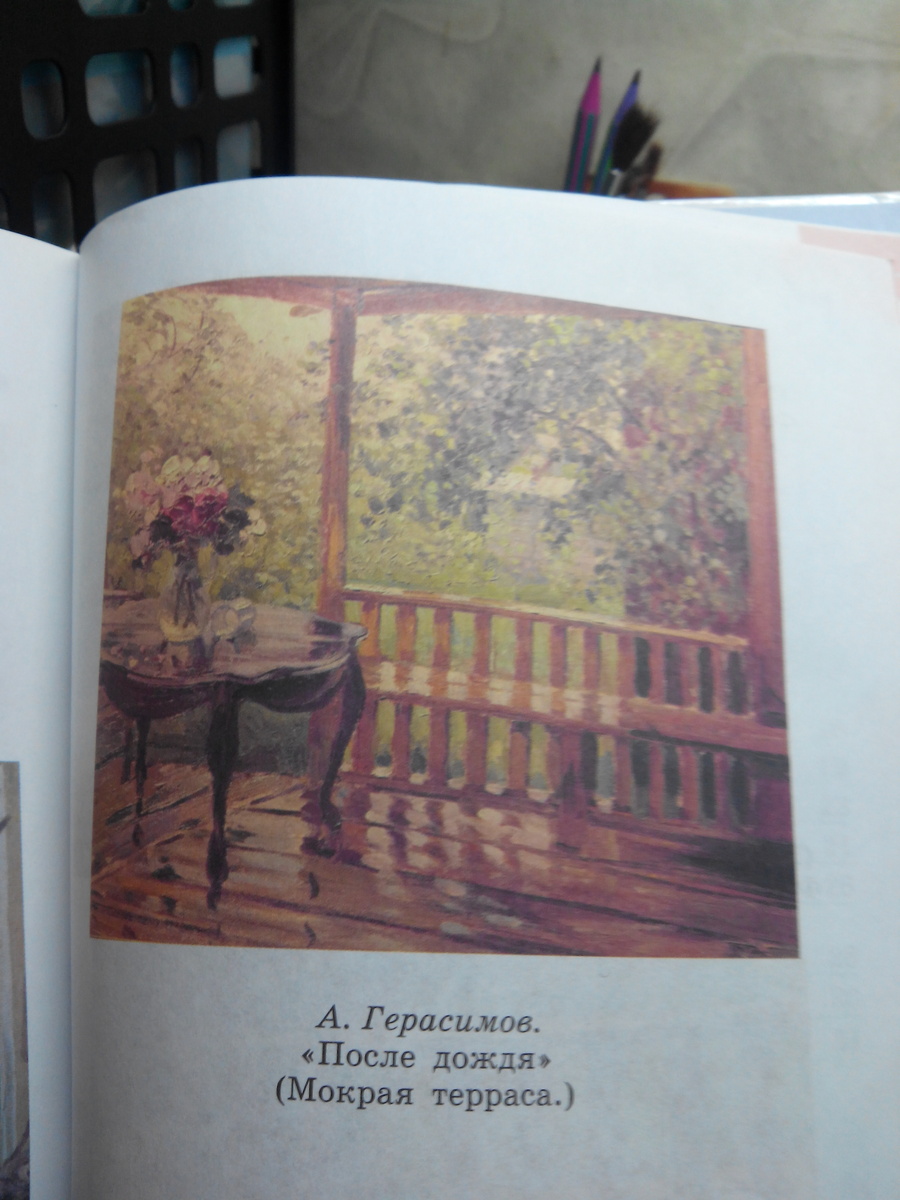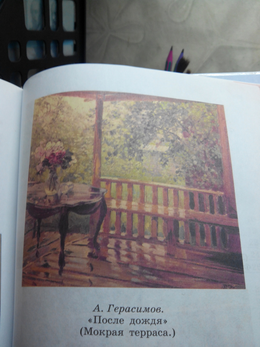 На картине Герасимова"После дождя" изображена терраса,на которой стоит столик с благоухающими цветами.Терраса мокрая от дождя-она блестит и переливается под только вышедшим солнцем.С перил еще стекают плотные капли.И все свежо и ароматно,так и хочется выйти на улицу и наслаждаться воздухом.Пышная крона дерева стала еще пышнее и чаще.И так увесистые ветки стали еще тяжелее от капель дождя.Стоит только легонько прикоснуться к одной веточке и все дерево будто обсыпало густой росой всего тебя.Такая солнечная и нежная картина,вмещающая в себя прохладу и сырость дождя,и тепло,свежесть после дождя.