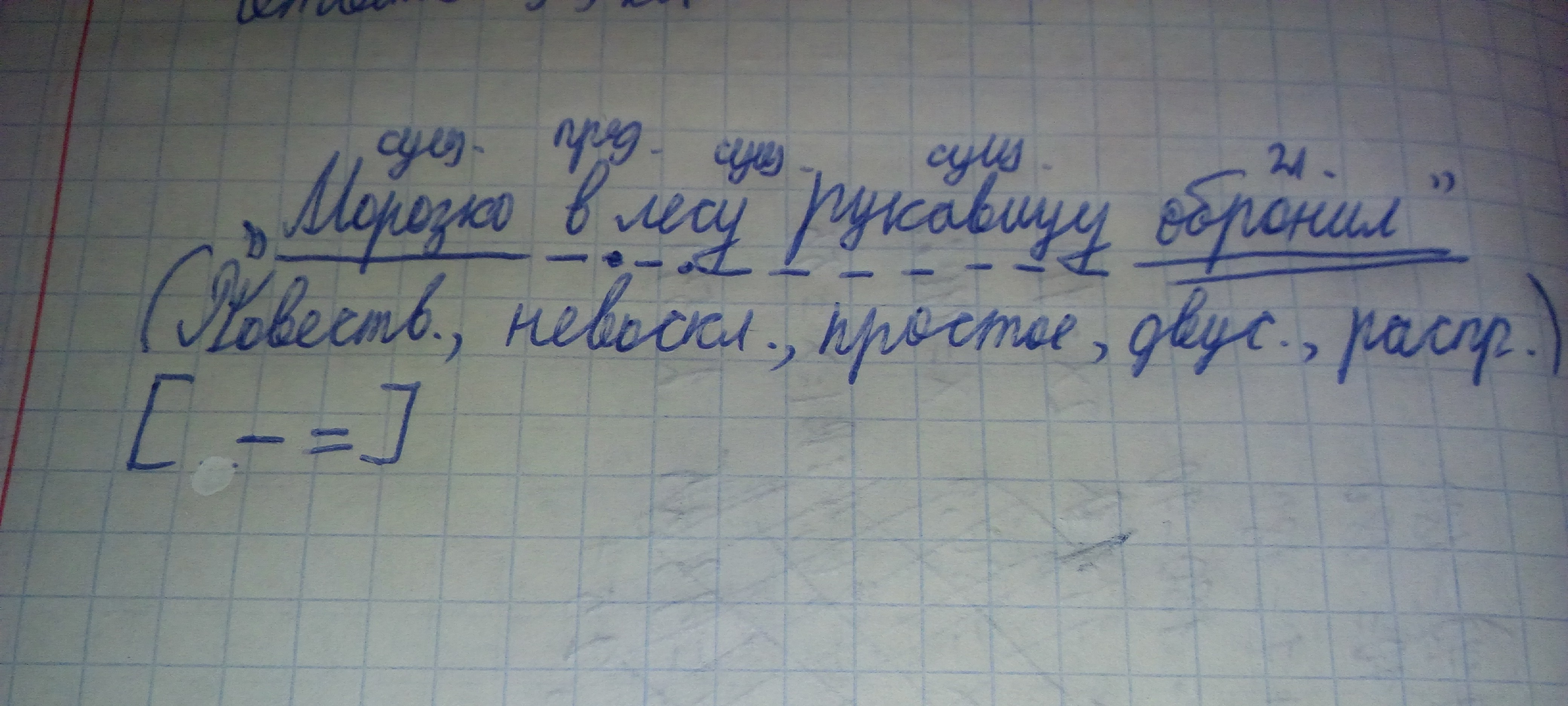 Морозко в лесу рукавицу обронил.(повеств.,невоскл.,прост.,распрост.,грамматическая основа:Морозко-подлежащее,обронил-сказуемое.)