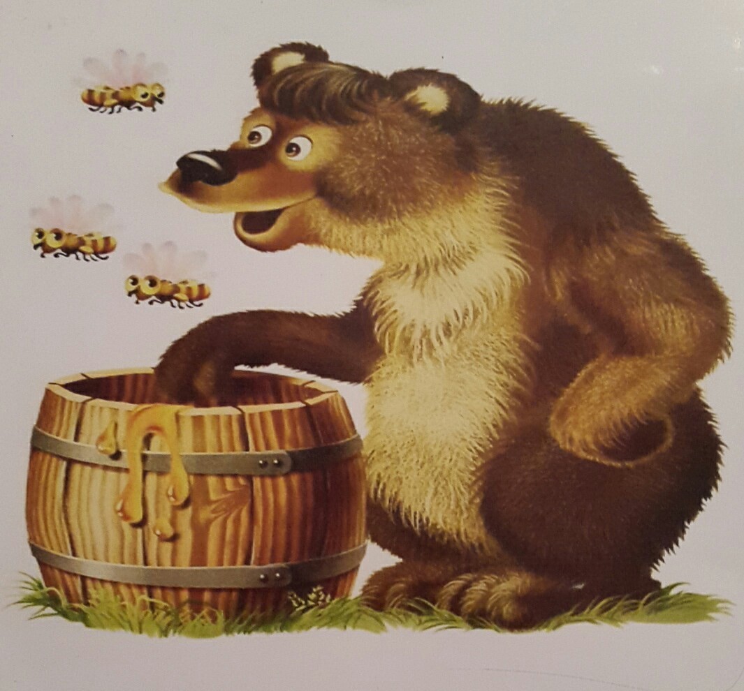 Посмотрев первый раз, мы увидим что на картине стоит мишка, опуская руку в бочку что мёдом, с улыбкой смотря на трех маленьких пчелеок. Создаётся впечатление, что мишка украл у них мед, а они прилетели обратно, за своим. Мишка на столько сильно опустил лапку ведро, что мед потек через верх, и стекает по бочки. Это что мы видим на переднем плане, а на заднем просто белая стена.