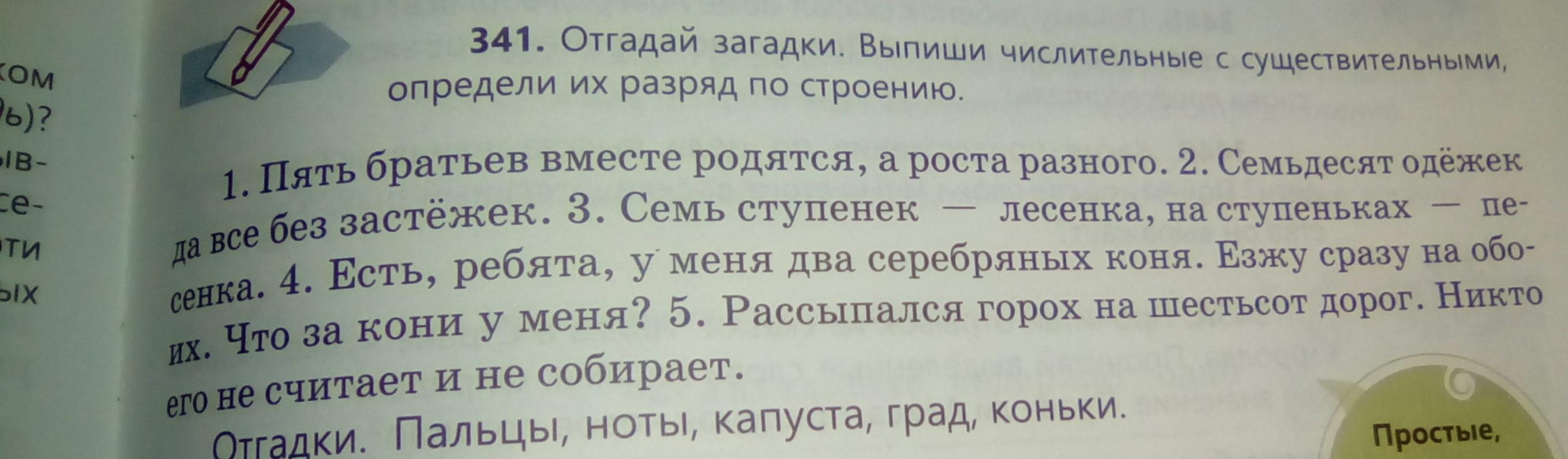 Отгадай загадки.Выпиши числительные с существительными,определи их разряд по строению.1.Пять братьев вместе родятся, а роста разного.