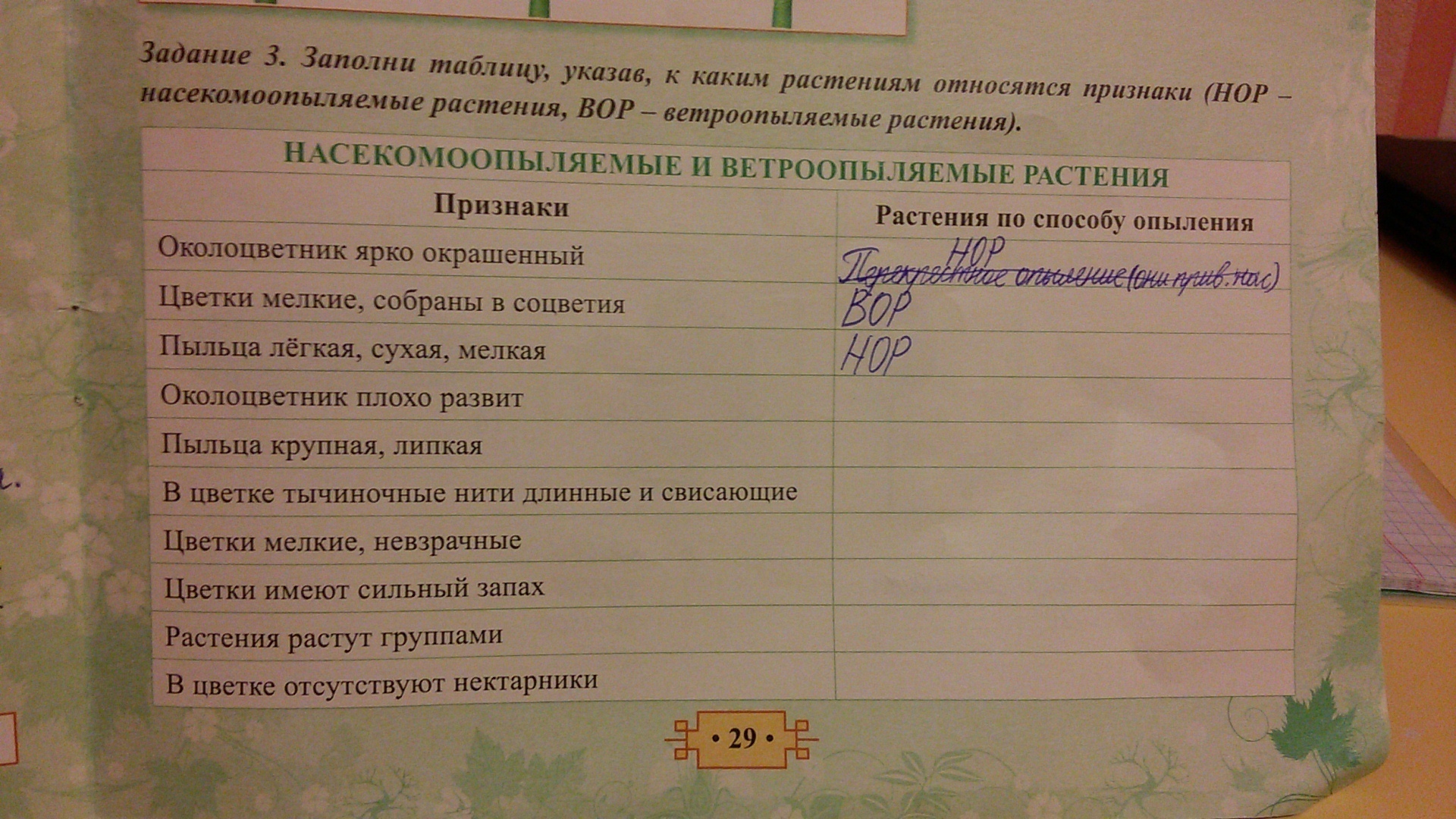 заполни таблицу указав, к каким растениям относятся признаки ( НОР - насекомоопыляемые растения, ВОР - ветроопыляемые растения)