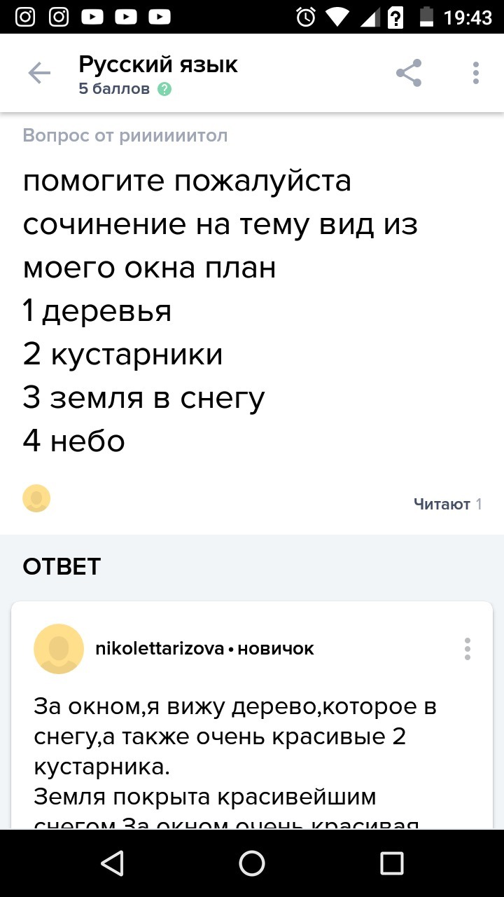 у меня был очень красивый вид из окна.Там были большие красивые деревья.Группа школьников решила там посадить кустраники.Но как на зло всю ночь на улице шел снег.На утро я встаю и деревьяв и духом не видать.Сначала меня ослепила этот белоснежный снег.Но потом я увидела как же это красиво.Это даже сравнится не могло сдеревьями и кустарниками.Я удивляюсь силом природы.Ведь только вчера ничегт не было .но за одну ночь сделать такое .. это просто чудо. я посмотрела на небо а там все еще идет снег.Теперь у меня очень красивый вид сюиз окна