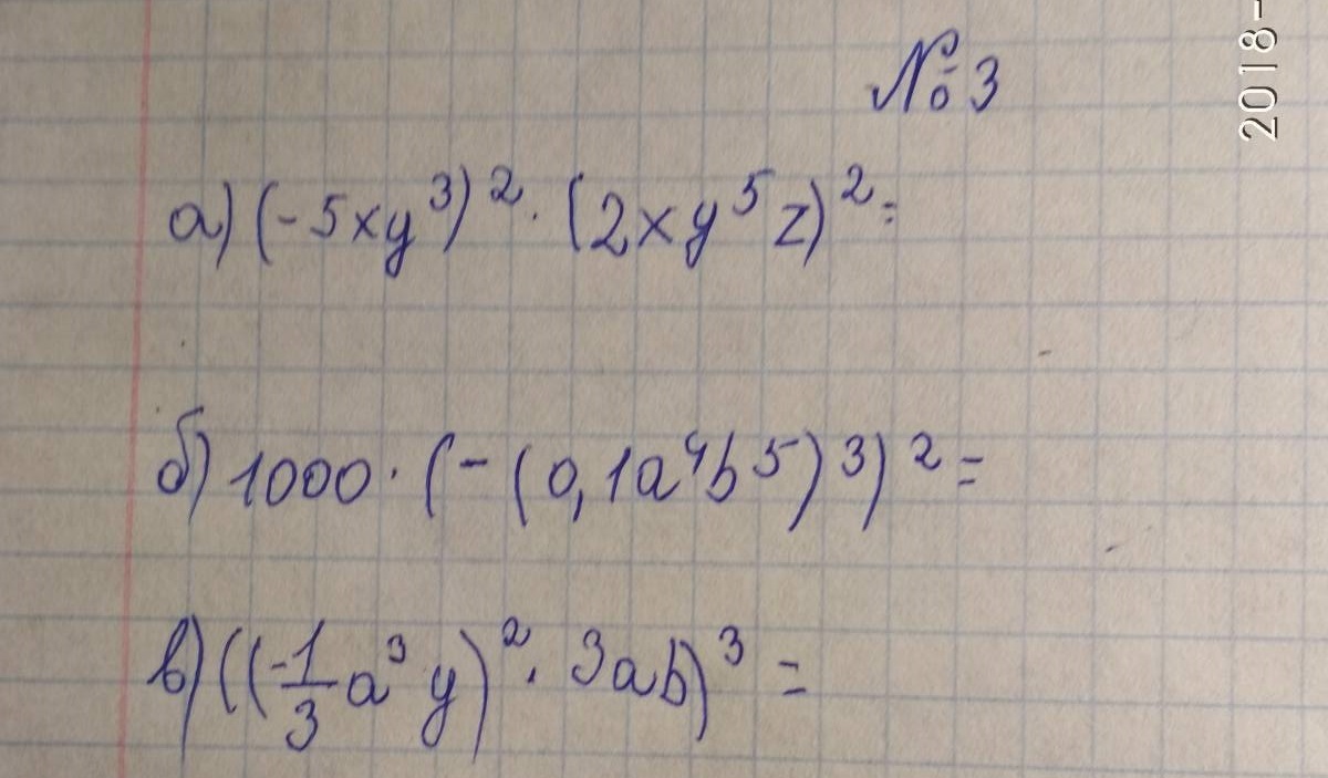 (-5xy^3)^2*(2xy^5z)^2=25x^2y^6*4x^2y^{10}z^2=100x^4y^{16}z^2 \ \ \ 1000*(-(0.1a^4b^5)^3)^2=1000*{(0.1a^4b^5)}^6=10^3*0.1^6a^{24}b^{30}= \\ =10^3*10^{-6}a^{24}b^{30}= frac{1}{10^3} a^{24}b^{30}= frac{a^{24}b^{30}}{1000}  \  \  \