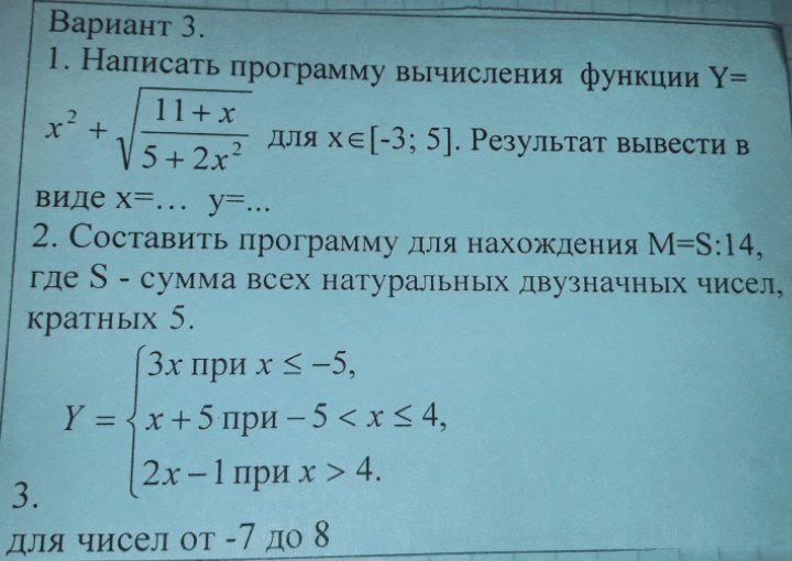 2. Составить программу для нахожения M=S:14, где S - сумма всех двузначных чисел, кратных 5. Y= система 3x при x<=-5, x+5 при -5< x <= 4, 2x-1 при x>4.