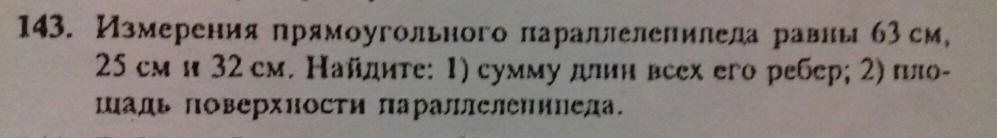 У параллелепипеда имеется 4 ребра по 63 см, 4 по 25 см и 4 - по 32 см.