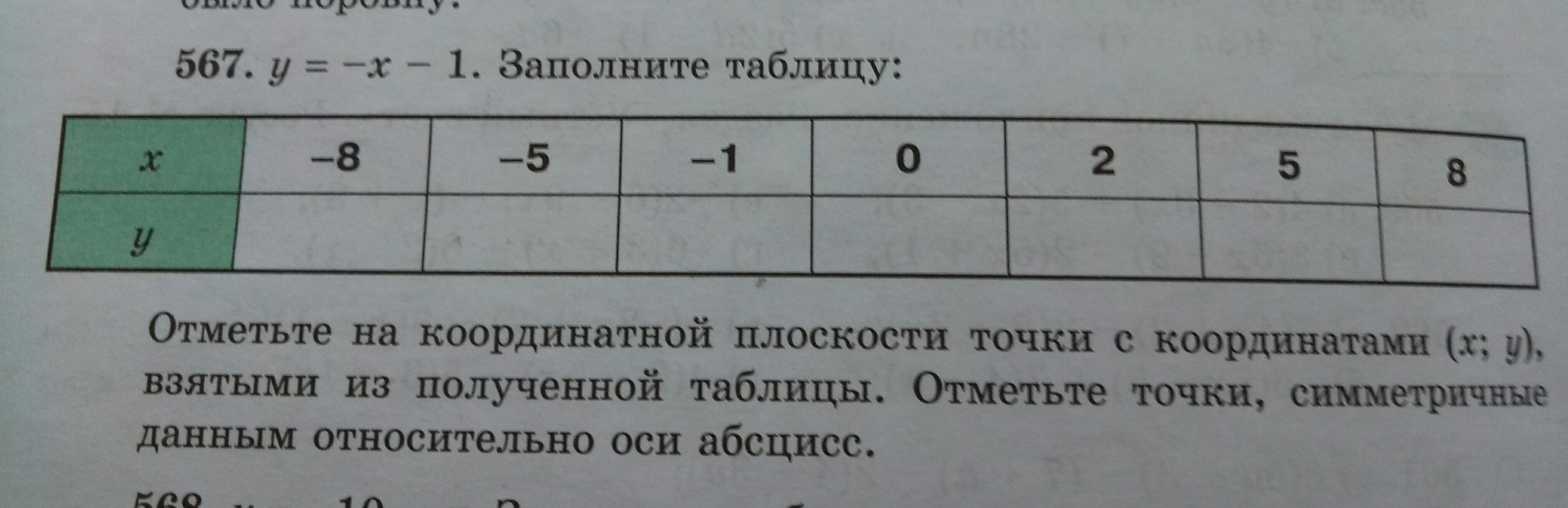 1)y = -(-8)-1; y=8-1; y=7 и так подставлять каждое значение x в формулу y= -x -1