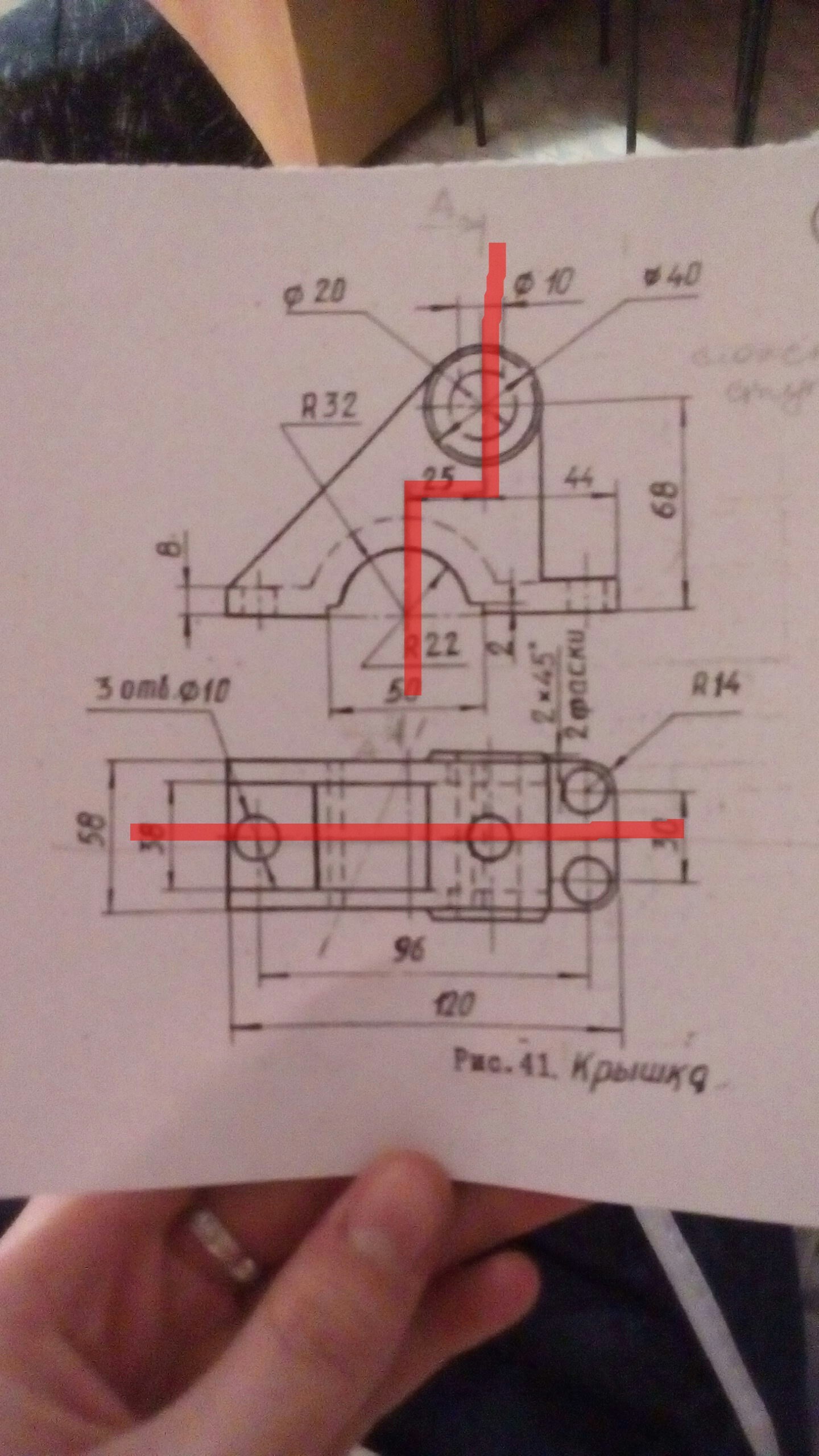 Еще нужно выполнить сложный разрез (я выделила его красной линией) на виде спереди и простой разрез на виде сверху.