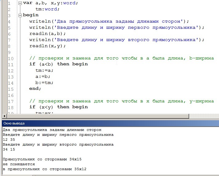 два прямоугольника заданы длинами сторон. написать программу, после выполнения, которой выясняется, можно ли первый прямоуголник целиком разместить во 2. Паскаль.
