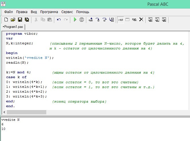 Очень запутанное в начале условие. Если число делится на 4, то вывести 4*частное (а частное и есть результат деления на данное число 4)... Получается, что при делении числа на 4 переменной N присвоится значение 4*результат, а это и есть число N.