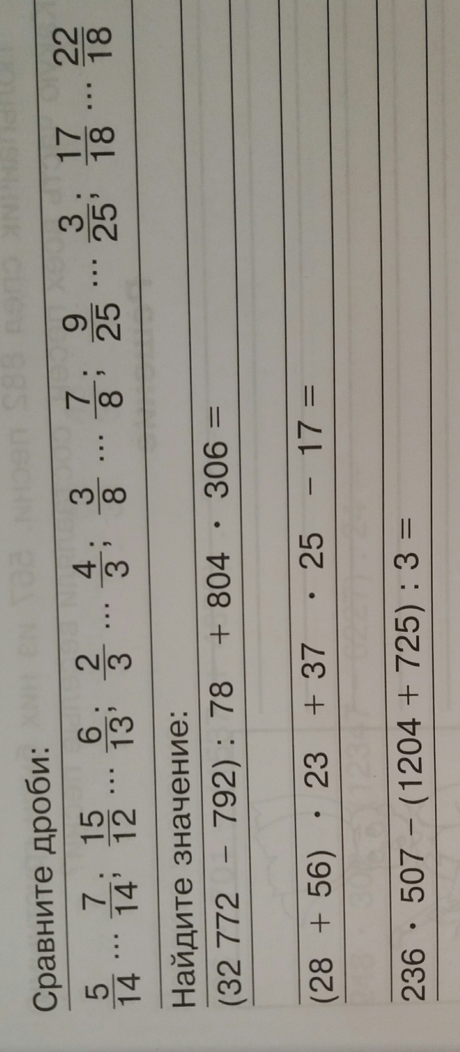 Сравнить дроби: 5/14<7/14, 15/12(195/156)>6/13(72/156), 2/3<4/3, 3/8<7/8, 9/25>3/25, 17/18<22/18.
