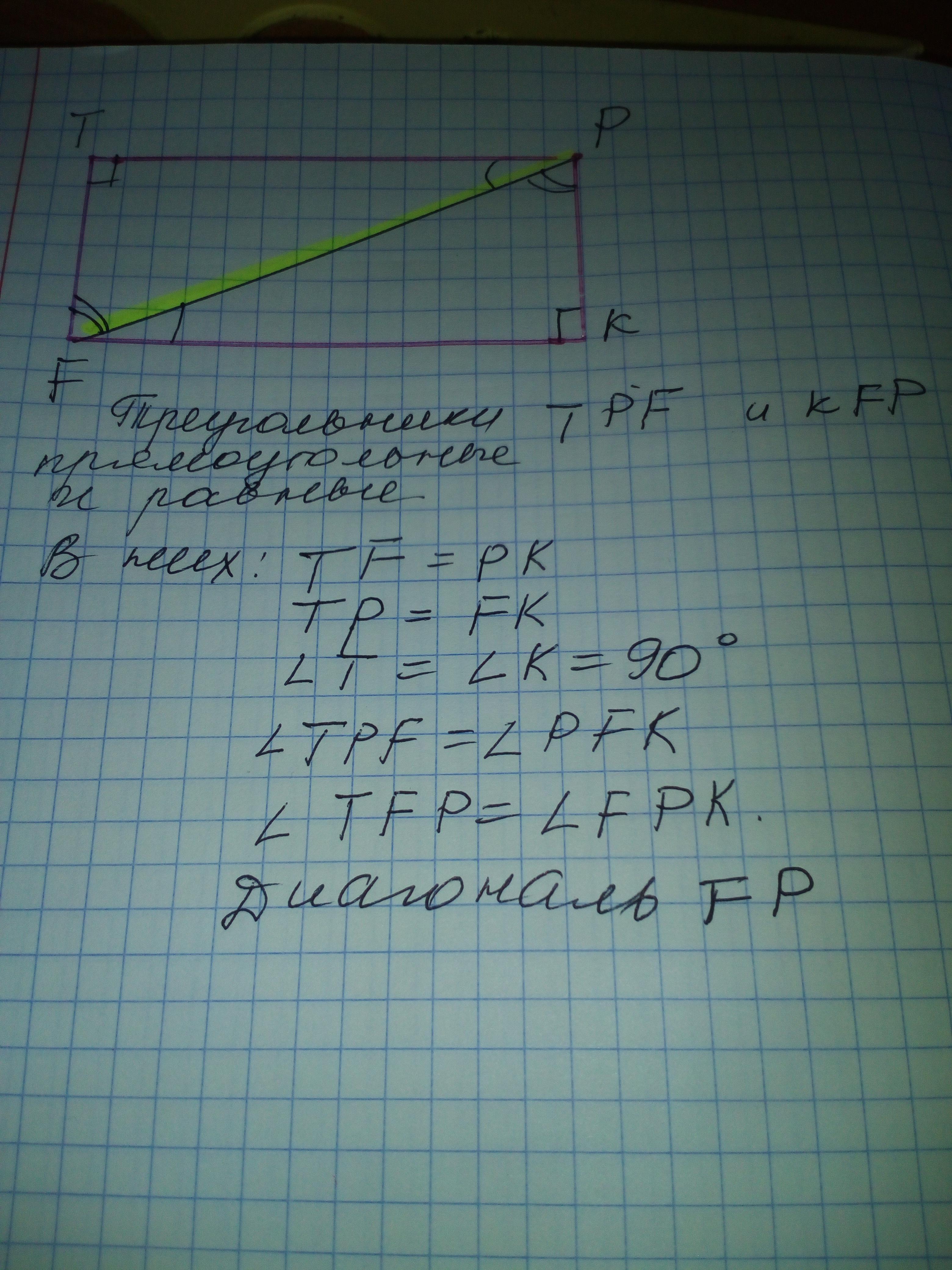 начертите прямоугольник, обозначьте его и проведите одну диагональ. Диагональ разделила прямоугольник на два равных треугольника. Покажите на чертеже и назовите их равные стороны и равные углы.