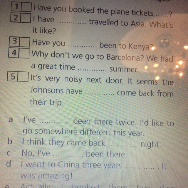 Fill in:already ,just ,yet,never, ever,last,ago. Then, math 1-5 to a-e to make exchanges