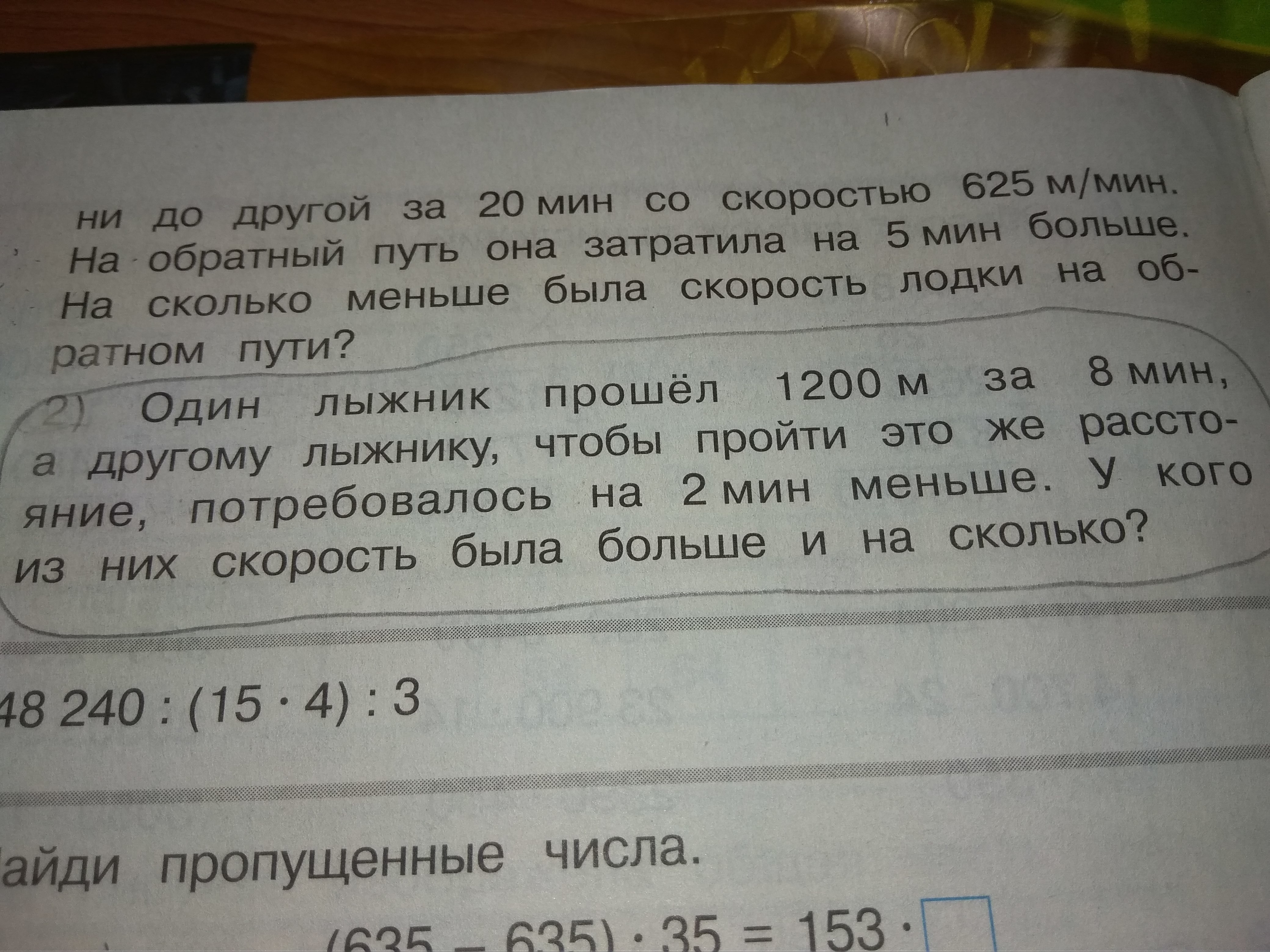 3) 1200:6=200 (м/мин)- скорость 2 лыжника 4) 200-150=50 (на 50 м/мин)- скорость 2 лыжника больше