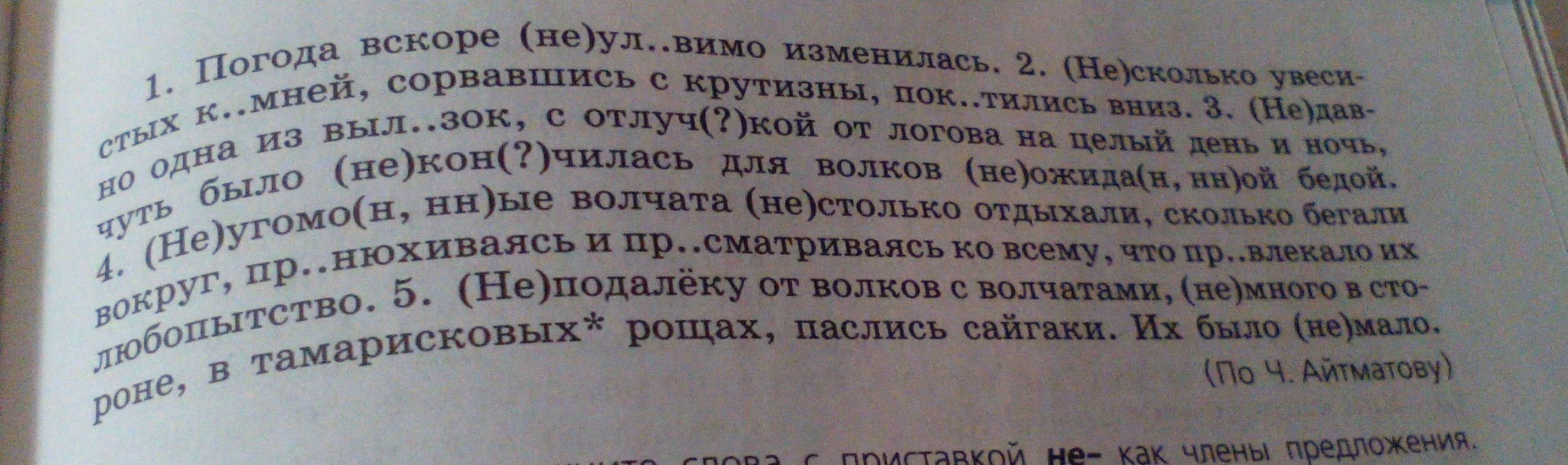 5. Неподалёку (¬НЕ = рядом) от волков с волчатами, немного (¬НЕ = отчасти) в стороне, в тамарисковых рощах, паслись сайгаки. Их было немало (¬НЕ=много).