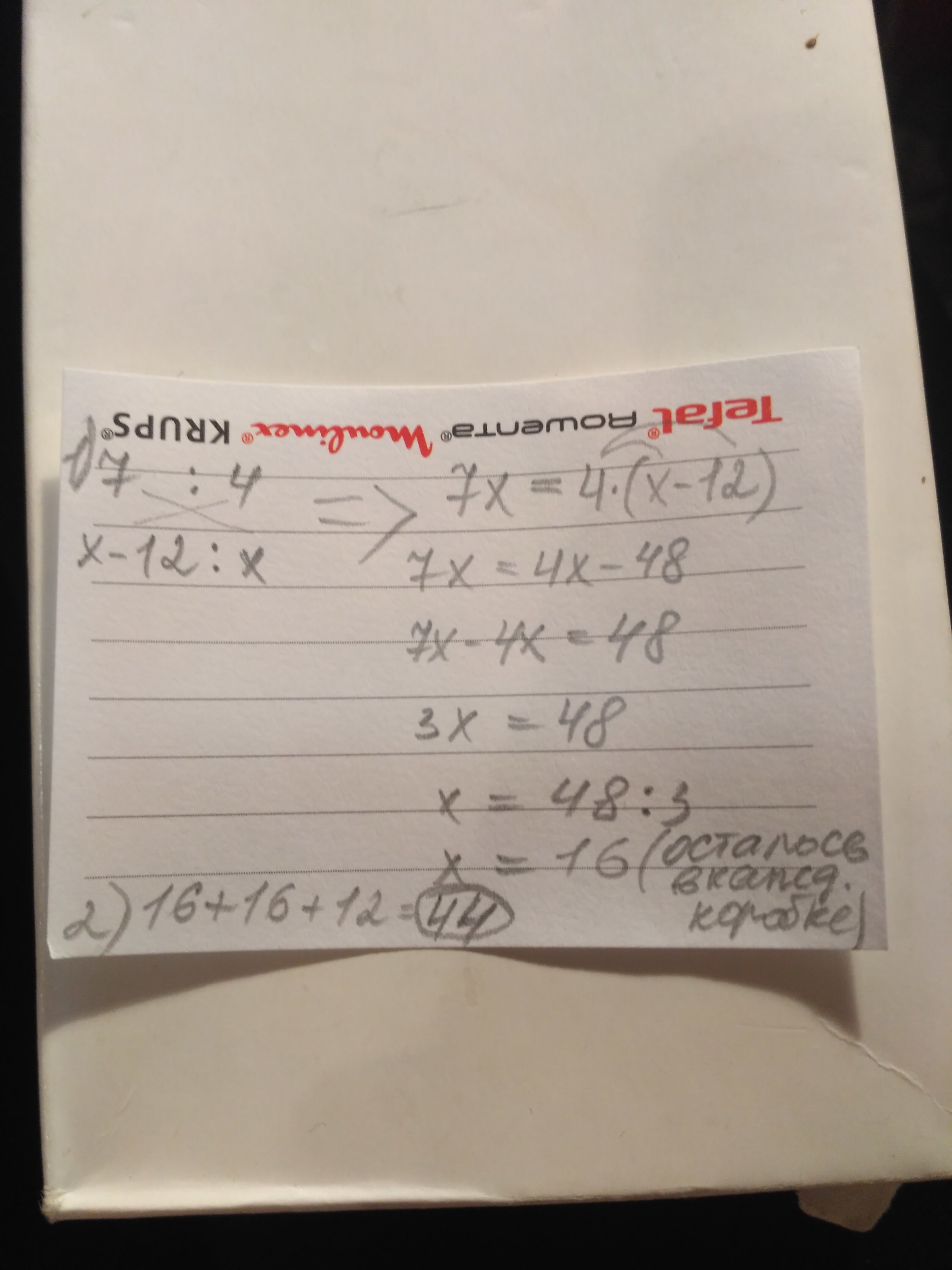 Учитель разложил весь имеющийся мел в 2 коробки в отношении 7:4.Когда из первой коробки израсходовали 12 кусков мела,то мела в коробках стало поровну.Сколько всего кусков мела было у учителя первоначально?