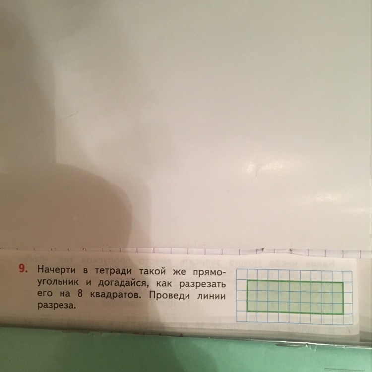 Начерти в тетради такой же прямоугольник и догадайся, как разрезать его на 8 квадратов. Проведи линии разреза.