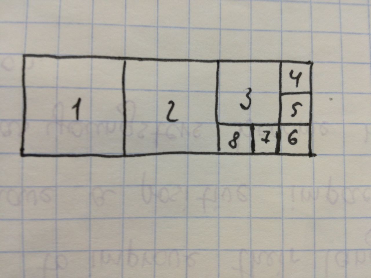 Два квадрата 3 на 3, один 2 на 2 и 5 1 на 1