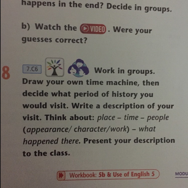 Работать в группе. Нарисуйте свою собственную машину времени, а затем решить, какой период истории вы бы посетить. Напишите описание вашего визита. Подумайте: место-время-люди (внешний вид / характер / работа) - что там произошло. Представляем вашему описанию класса.
