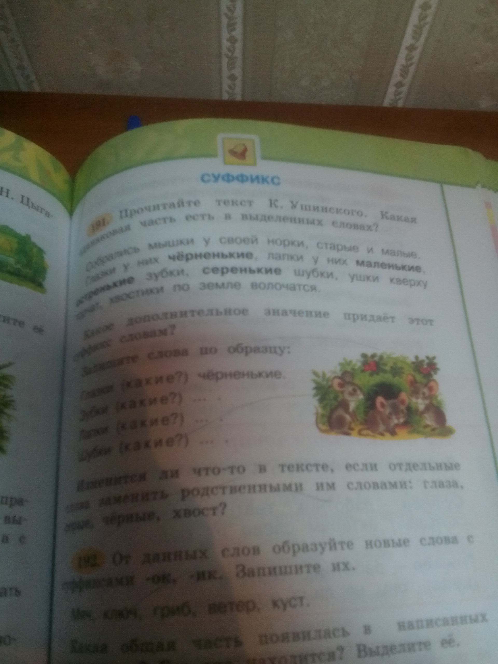 В выделенных словах одинаковая одинаковая часть-суффикс -еньк,который придаёт словам ласкательное,уменьшительное значение...Глазки(какие?) чёрненькие,зубки(какие?) остренькие,лапки(какие?) маленькие,шубки(какие?) серенькие...При замене отдельных слов родственными им словами в тексте теряется нежность,ласковость в повествовании.