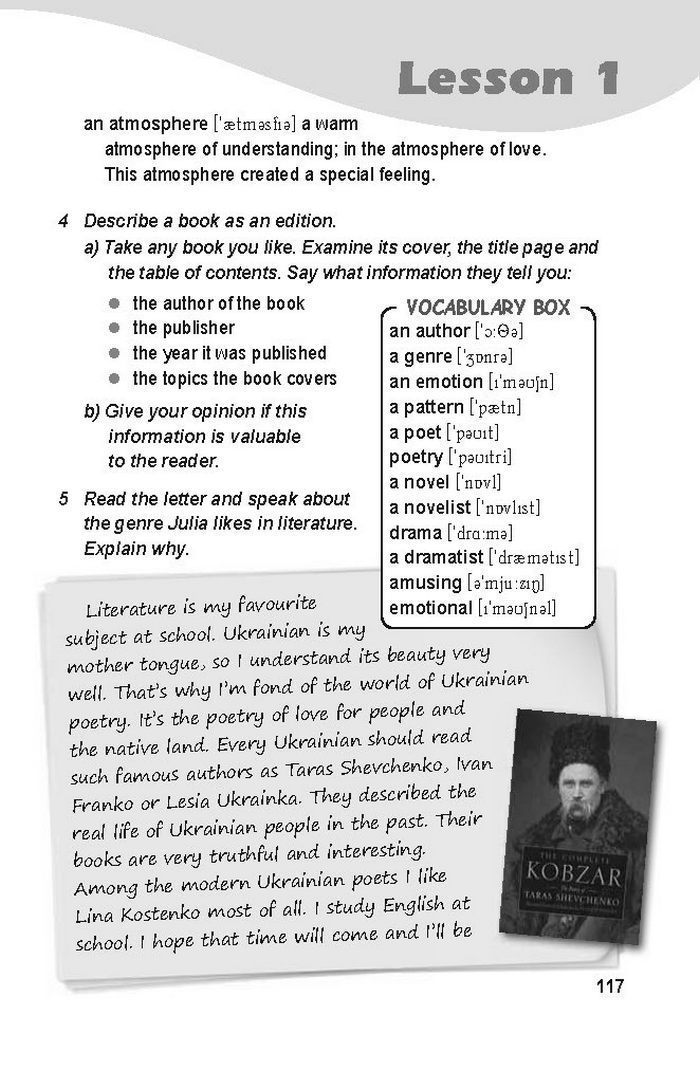 Литература - мой любимый урок в школе. Украинский язык - это мое материальное чувство, поэтому очень хорошо его понимаю. Вот почему он любит мир украинской поэзии. Это поэзия любви к людям и родине. Каждому украинцу следует читать таких известных авторов, как Тарас Шевченко, Человек. Пранко ар Леси Украинки. Они рассказали о реальной жизни украинского народа в прошлом. Их книги очень мрачны и интересны. Среди современных украинских поэтов, к примеру, Лина Костенко больше всего изучает английский язык в школе.
