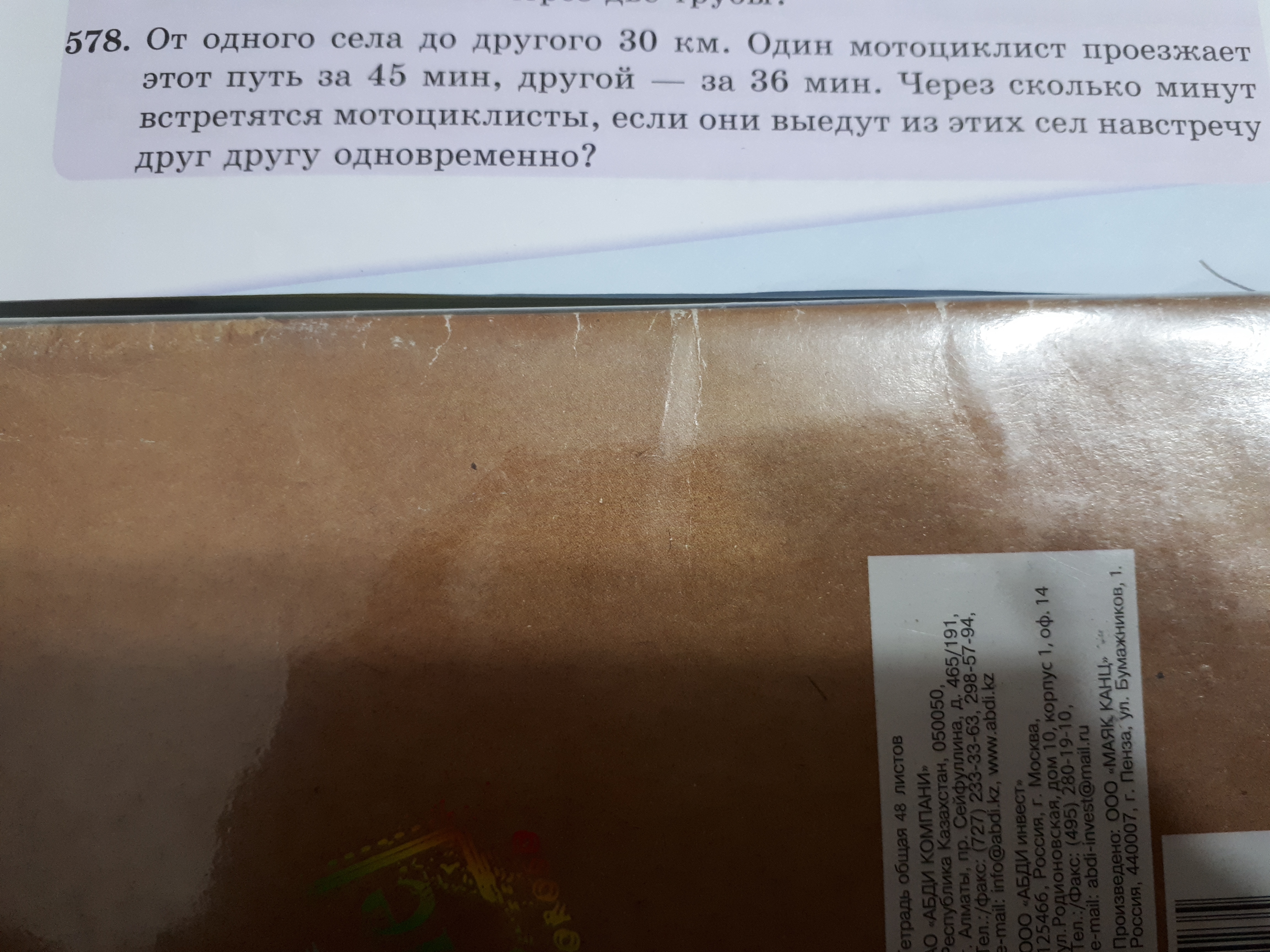 От одного села до другого 30 км. Один мотоциклист проезжает этот путь за 45 минут, а другой - за 36 минут. Через сколько минут встретятся мйфотоциклисты, если они выедут из этих сел навстречу друг другу одновременно?